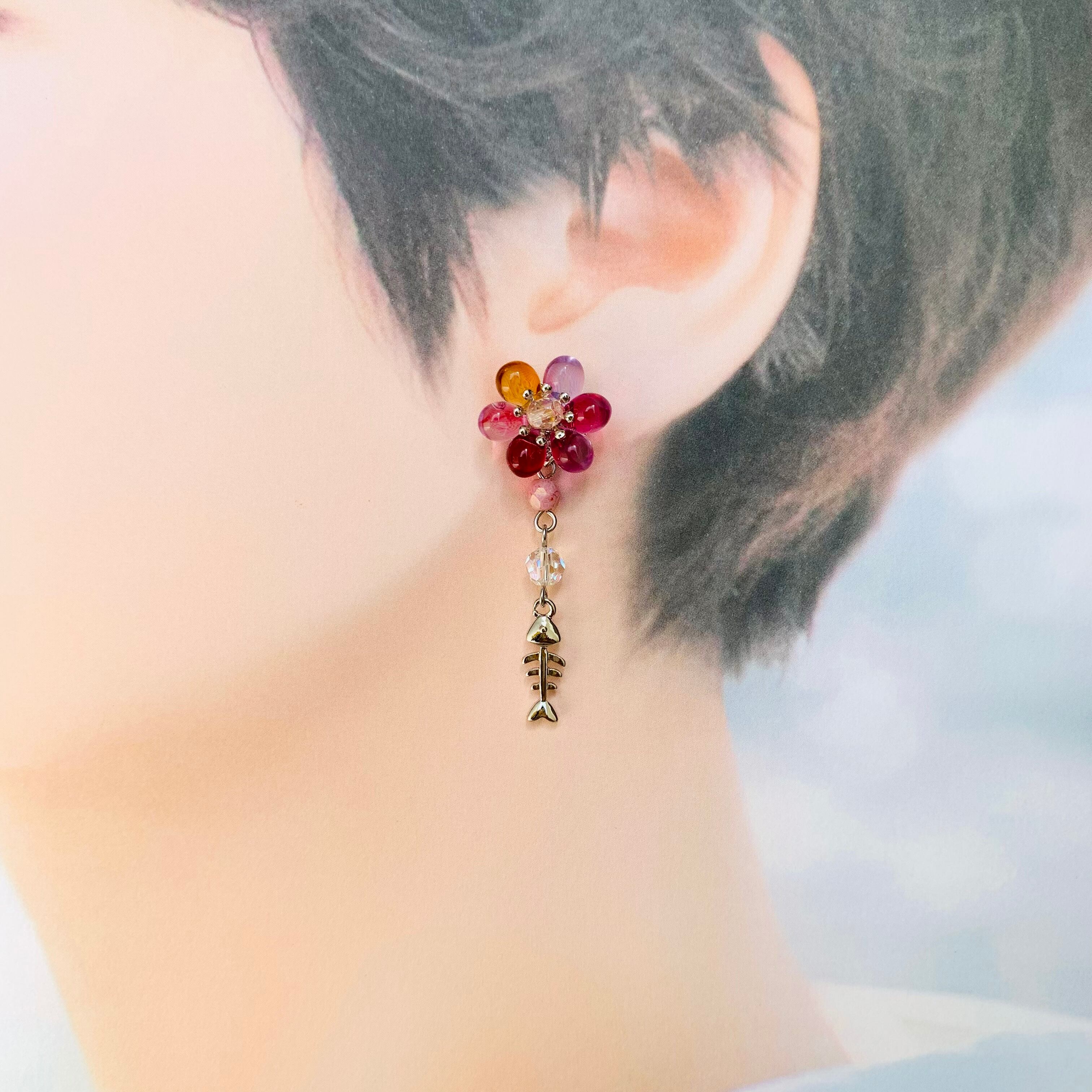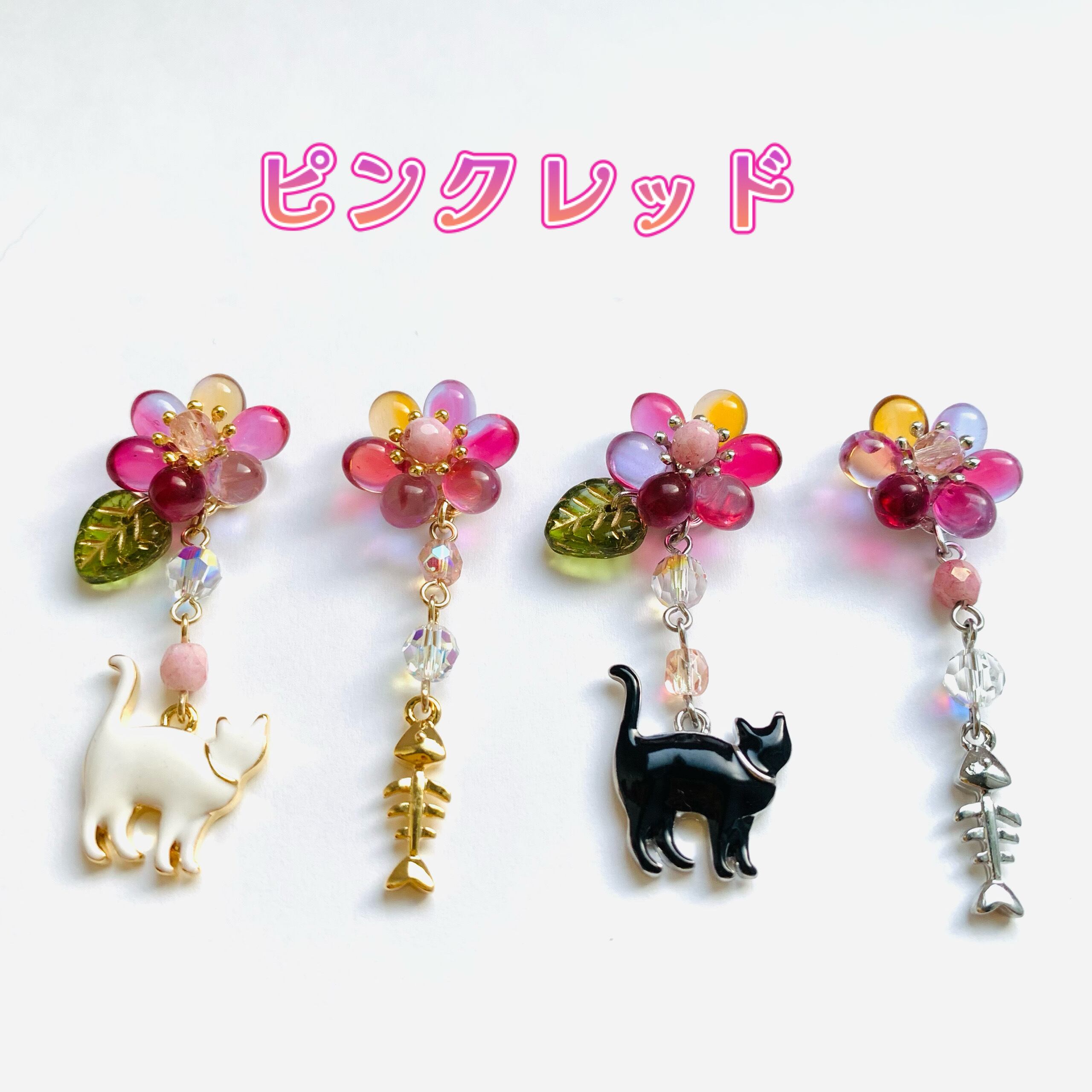 耳たぶにパッと咲いたお花の下には、キラキラ輝くチェコビーズ&クリスタルガラスとお魚を探すにゃんこ&既に骨になってしまった(笑)お魚が、歩く度にゆらゆらと楽しげに揺れます♪