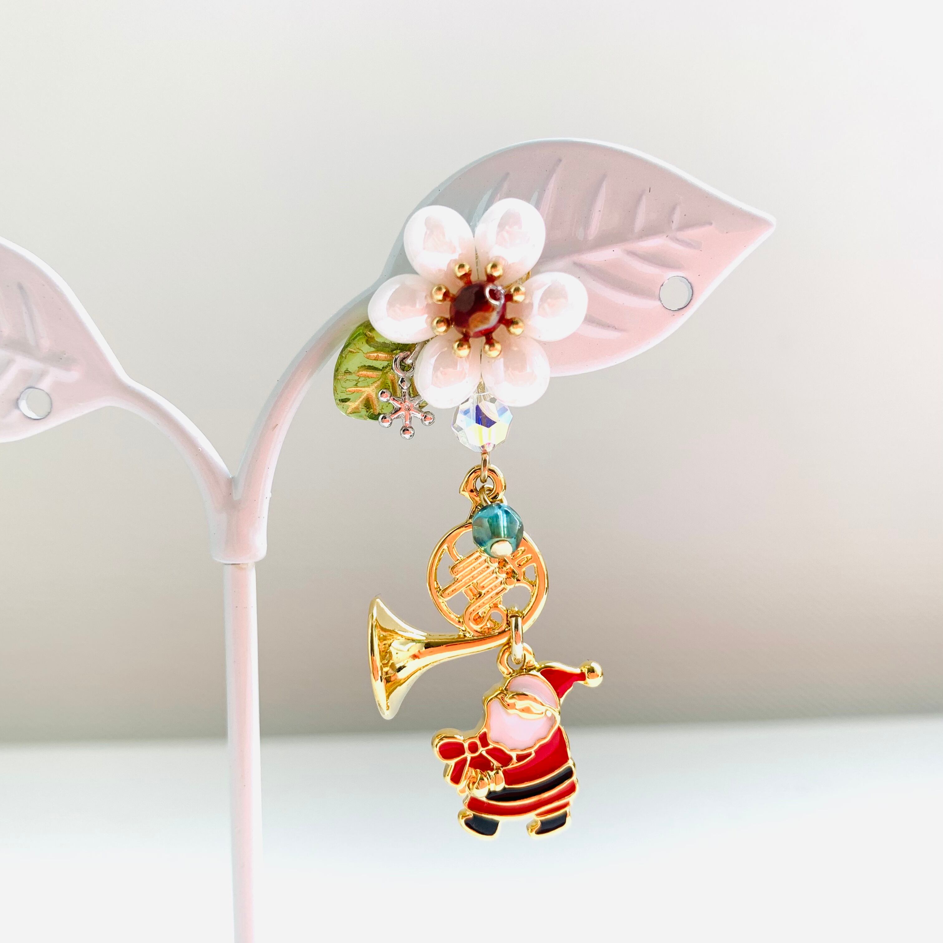 雪をイメージしたツヤ感のある白いチェコガラスビーズでお花を作り、その下にはクリスタルガラスとホルン、更にXmasの主役、あわてんぼうのサンタクロースをぶら下げました☆