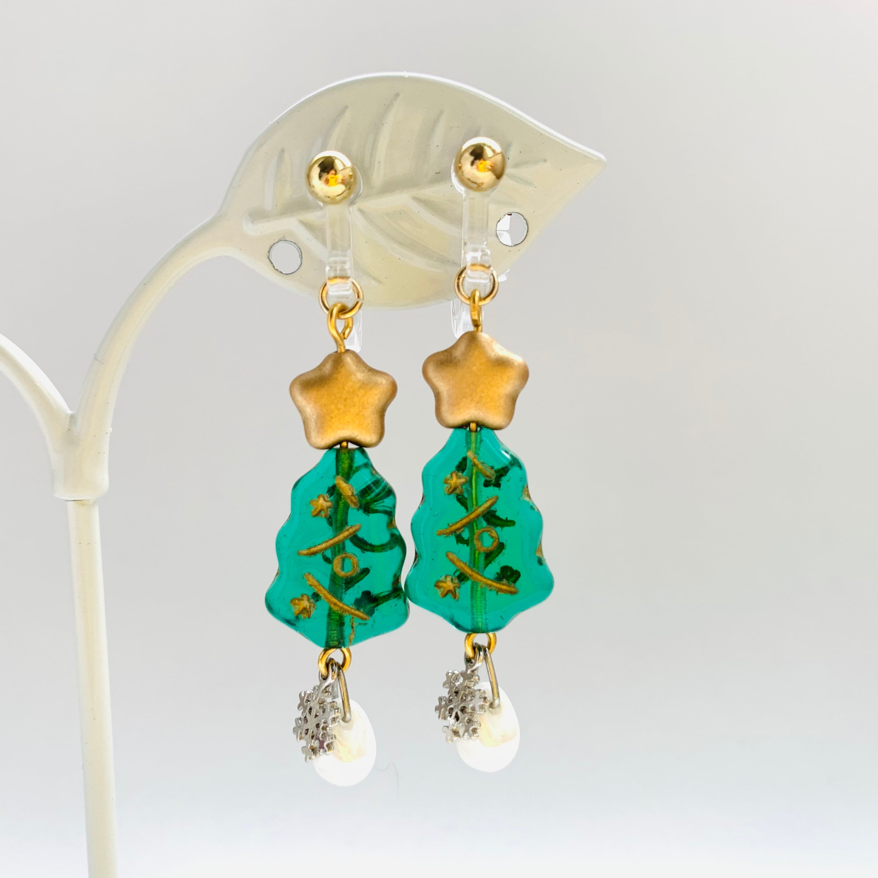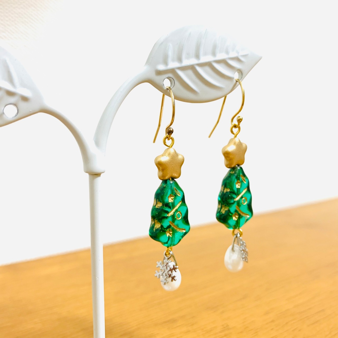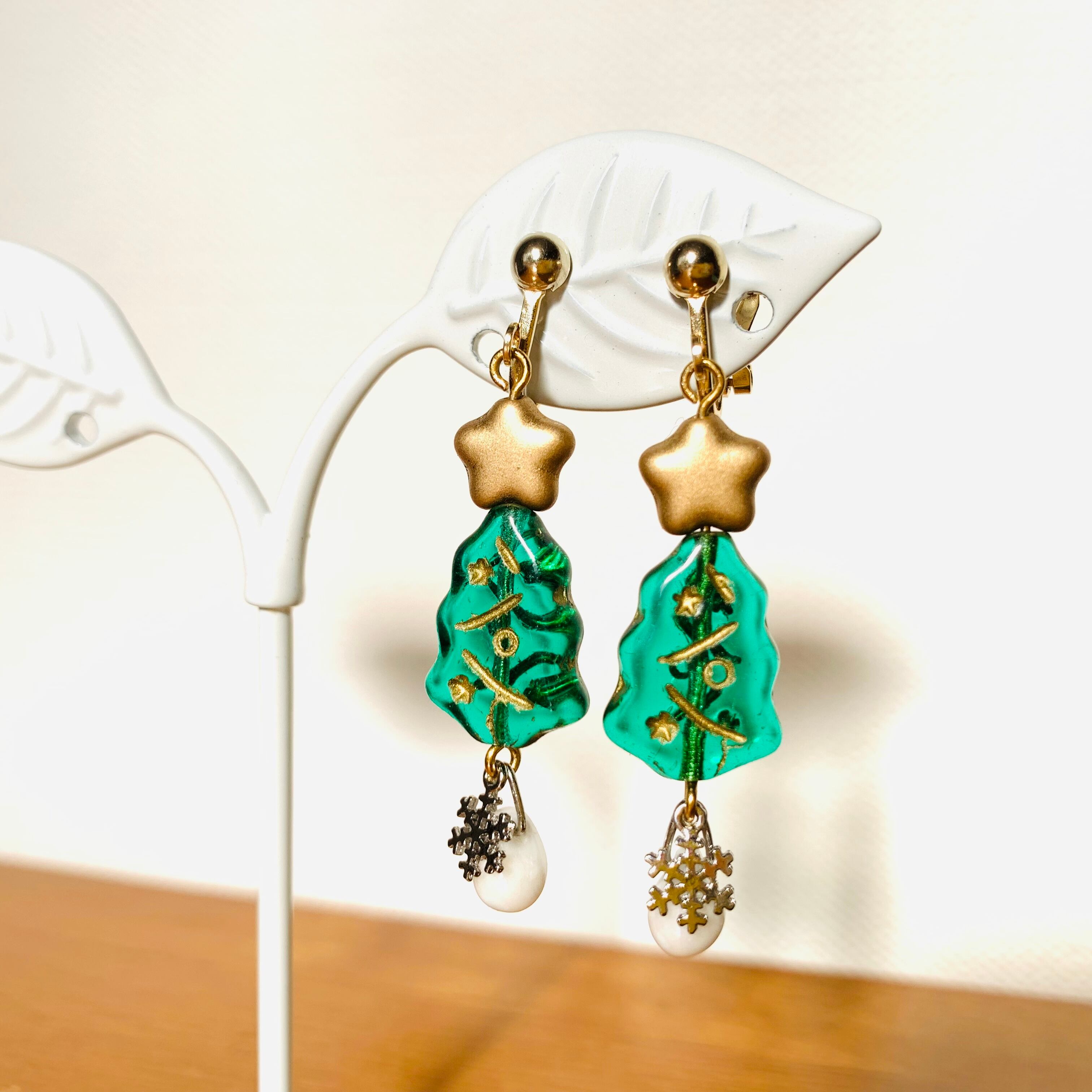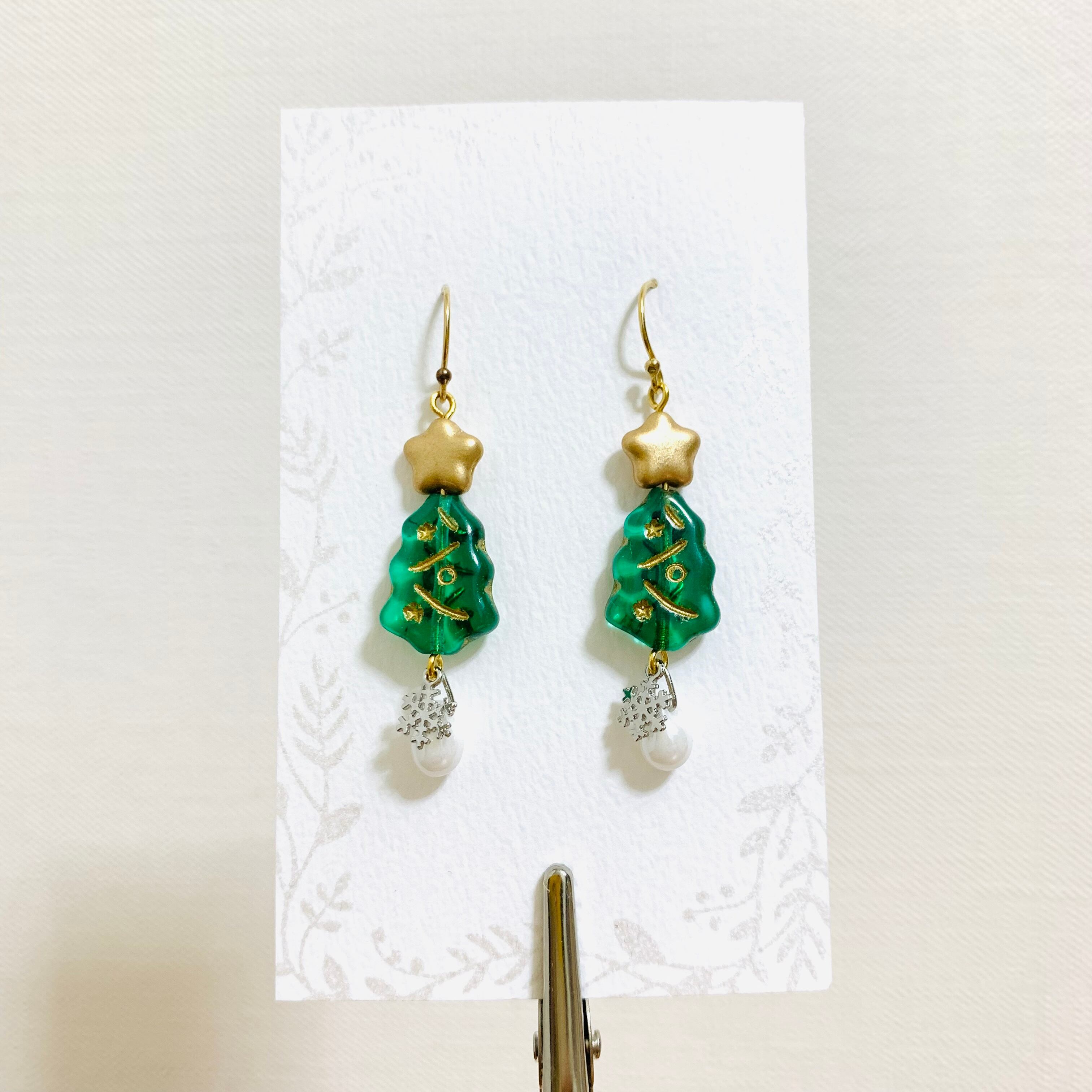 ツリーと星だけで充分可愛いピアスになったんですが、そのままで商品にしてしまうのは何だか悔しくて(笑)、もっと可愛くならないか?と色々考えた結果、白いチェコビーズと雪の結晶の雪がひとしずく降ることになりました(*´﹀`*)